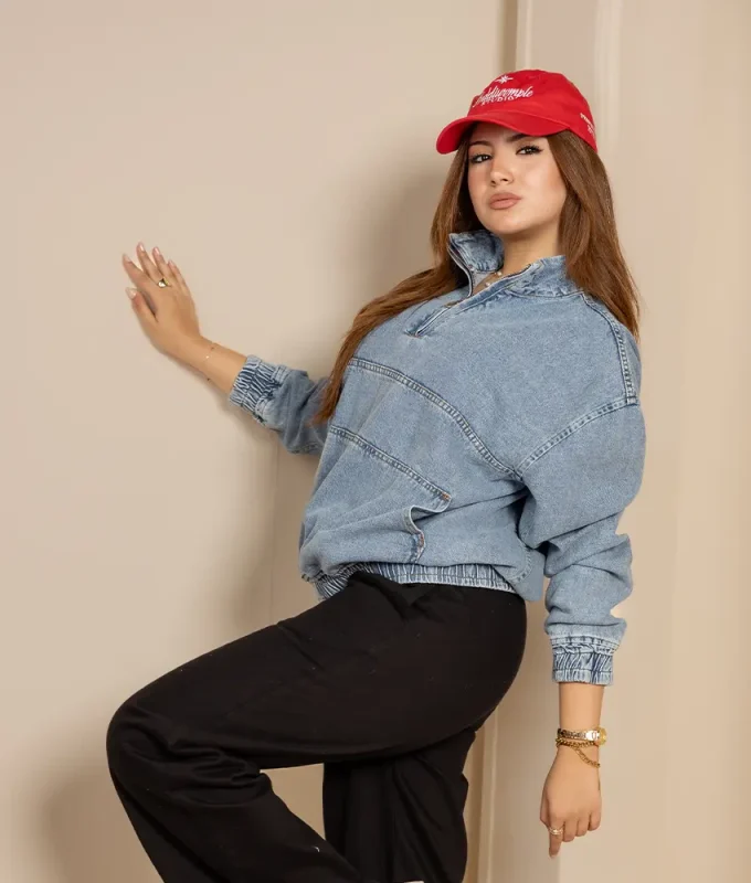 An oversized denim-inspired quarter-zip available in Light and Dark washes. Stylish, relaxed, and perfect for everyday wear.