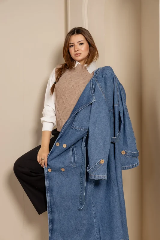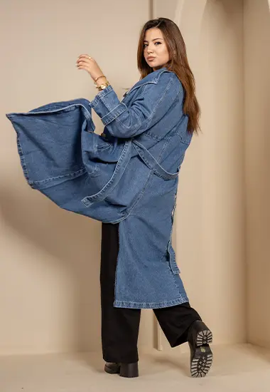 A statement oversized denim trench coat in dark wash—easy to layer, effortless to style, and built for bold everyday looks.