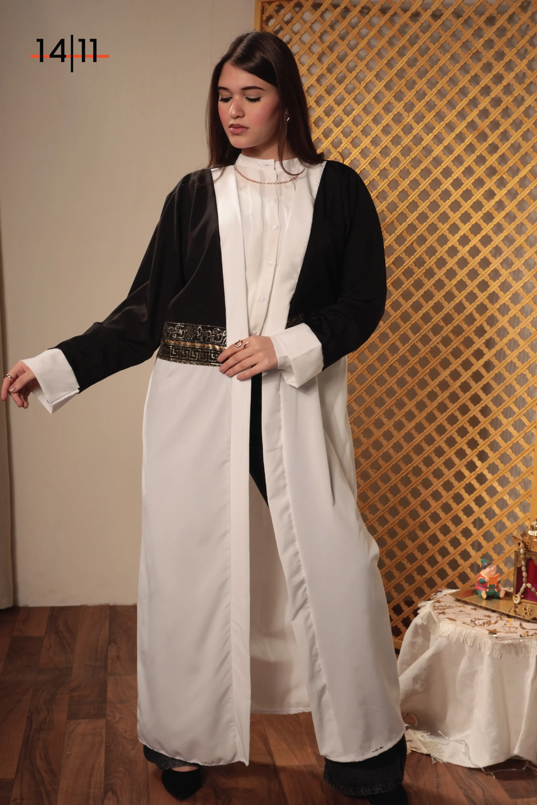 The Kaftan Dija combines an oversized fit with a striking black, white, and gold color palette, creating a statement piece that exudes sophistication. Its flowing silhouette offers comfort and ease, making it perfect for special occasions or stylish casual wear. Elegant yet effortless, this kaftan is designed to stand out.